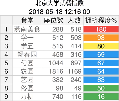 站着吃饭在北京大学已经不是什么新鲜事儿,也是一个难题。在全校师生翘首期盼四万平米大食堂早日落成的时刻,北京大学计算中心倾情推出就餐神器“北京大学就餐指数”,通过互联网实时报送各个食堂的就餐人数、拥挤程度,为打造有温度的智慧校园再添利器。5月16日,此项功能在校内门户甫一上线测试,就受到了师生们的广泛关注和一致好评。