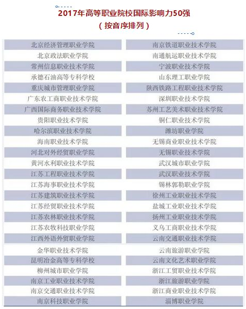 本年度再次评出“国际影响力50强”,这一榜单反映着中国高职教育国际交流合作的发展水平。与2016年相比,2017年“国际影响力50强”整体水平有所提升,全日制国(境)外留学生人数、非全日制国(境)外人员培训量、在校生服务“走出去”企业国(境)外实习时间、专任教师赴国(境)外指导和开展培训时间等指标平均值分别是上一年的1.6倍、4.6倍、1.4倍和1.5倍。50强院校体现了高职教育服务国家战略的意识和行动,也引导着高职院校更多关注国际交流与合作。