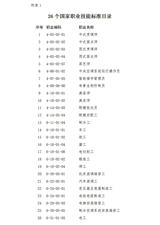 日前,人社部办公厅颁布中式烹调师等26个国家职业技能标准(见附表1)。国家职业技能标准是在职业分类的基础上,根据职业活动内容,对从业人员的理论知识和技能要求提出的综合性水平规定。它是开展职业教育培训和人才技能鉴定评价的基本依据(国家职业技能标准结构图见附表2)。